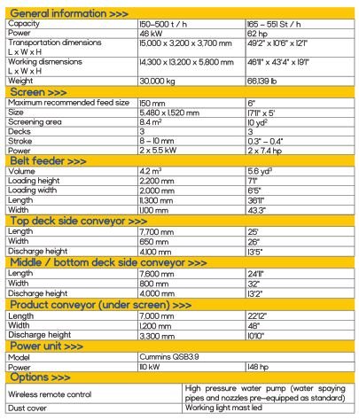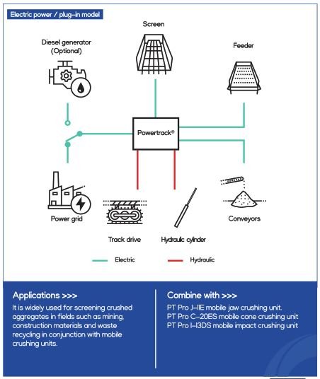 The Powertrack PT Pro SC-08E series mobile screening unit features a convenient screen design. Depending on the properties of the materials being screened, a wide range of screen media can be selected to control the final product granularity, ensuring efficient material screening. All conveyors can be hydraulically folded for easy transport. They are commonly used in conjunction with crushing equipment.